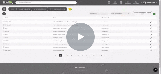 The Rate Code Maintenance and Group Code Maintenance screens contain all the rate and group codes that exist in HotelIQ. As rate codes and market segments have a one-to-one relationship in HotelIQ, the first time a new rate code enters HotelIQ, it gets locked to the market segment it came in under. Corporate Admins and Hotel Admins have the ability to edit and change the market segment mappings for rate/group codes if necessary by following these steps. Any changes made will be applied across all periods in HotelIQ.